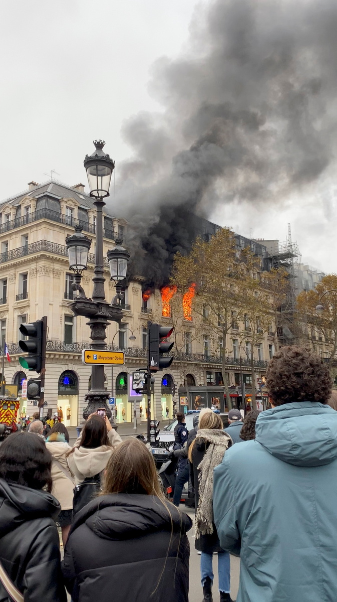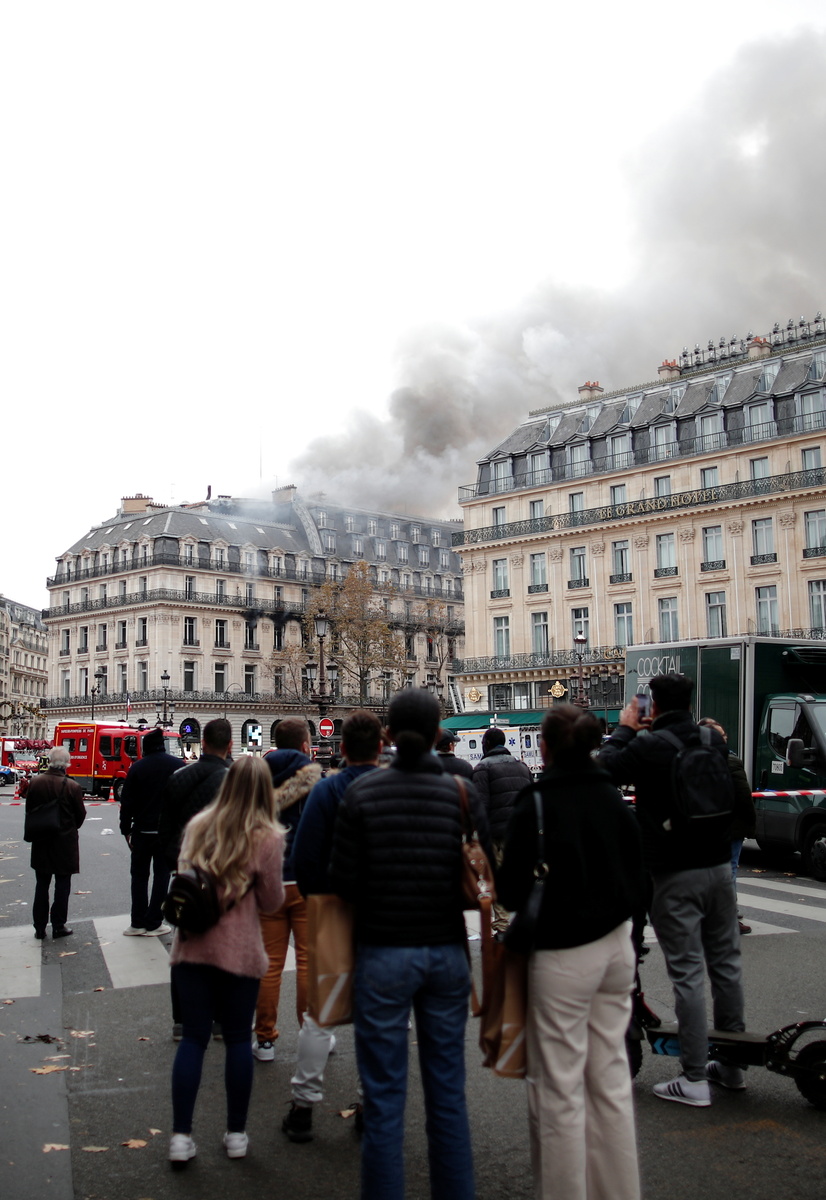 People watch as smoke billows from a building affected by a fire near the Opera Garnier in Paris, France, November 20, 2021. REUTERS/Benoit TessierFire and smoke come out of a building near Place de l'Opera in Paris, France, November 20, 2021 in this still image obtained from a social media video. @alex_grandremy/via REUTERS