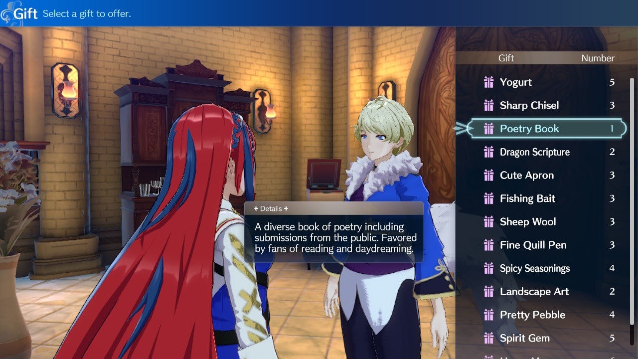 Your allies love gifts, but even though there’s a lot of overlap between some characters, they won’t just accept any junk you throw their way. They have individual likes and dislikes, and if you just hand things out without paying attention, you won’t get anywhere. Paying attention to what your allies say in Bond and Support conversations can give you some insight, but if you ever need a reminder, check the Ally Notebook under Reference in the menu.