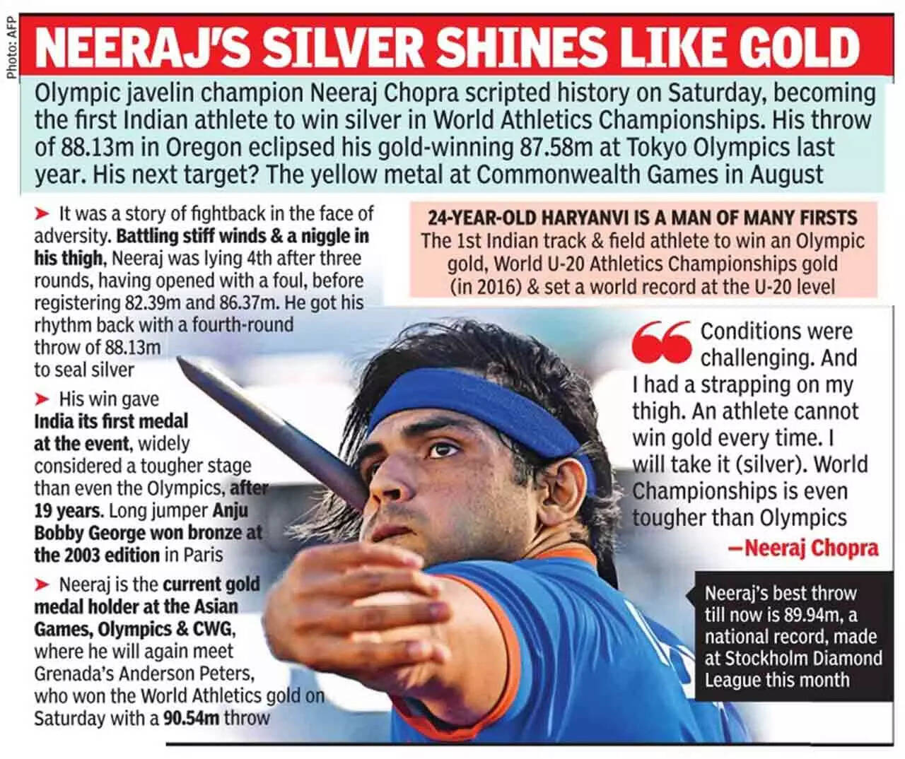 Still, Neeraj isn't complaining. He is happy with his show at Eugene but determined to change the colour of the medal next time around.