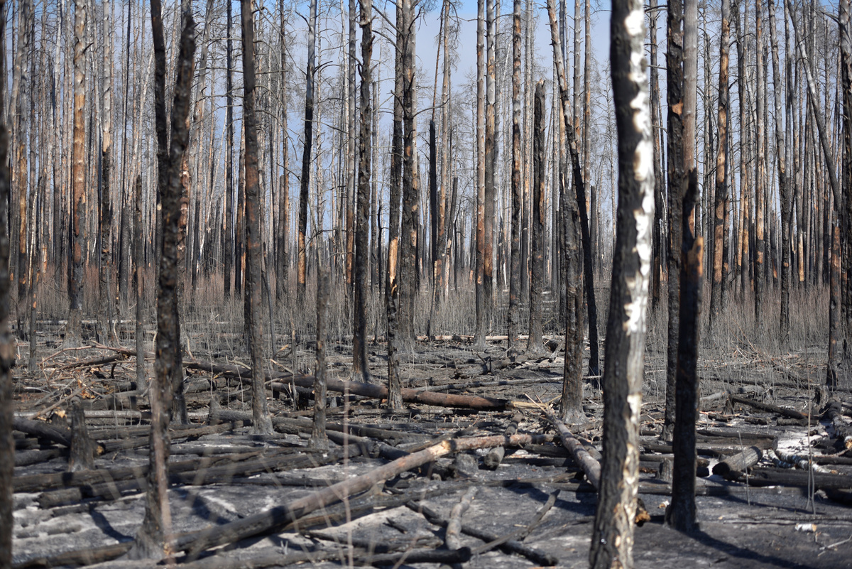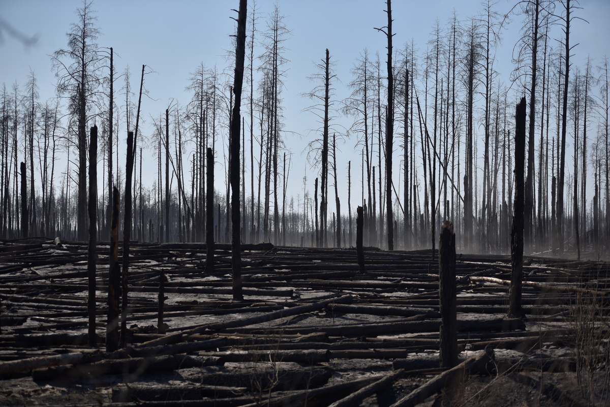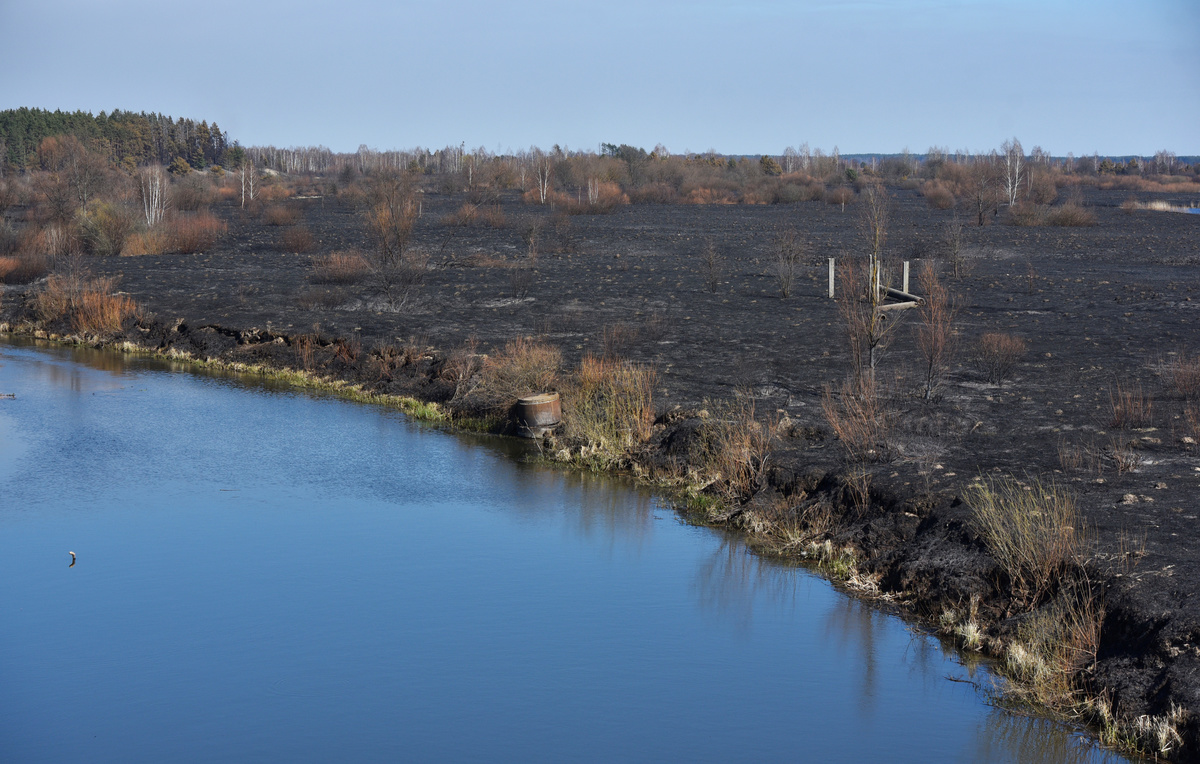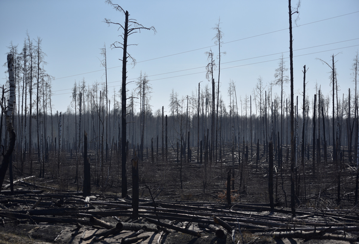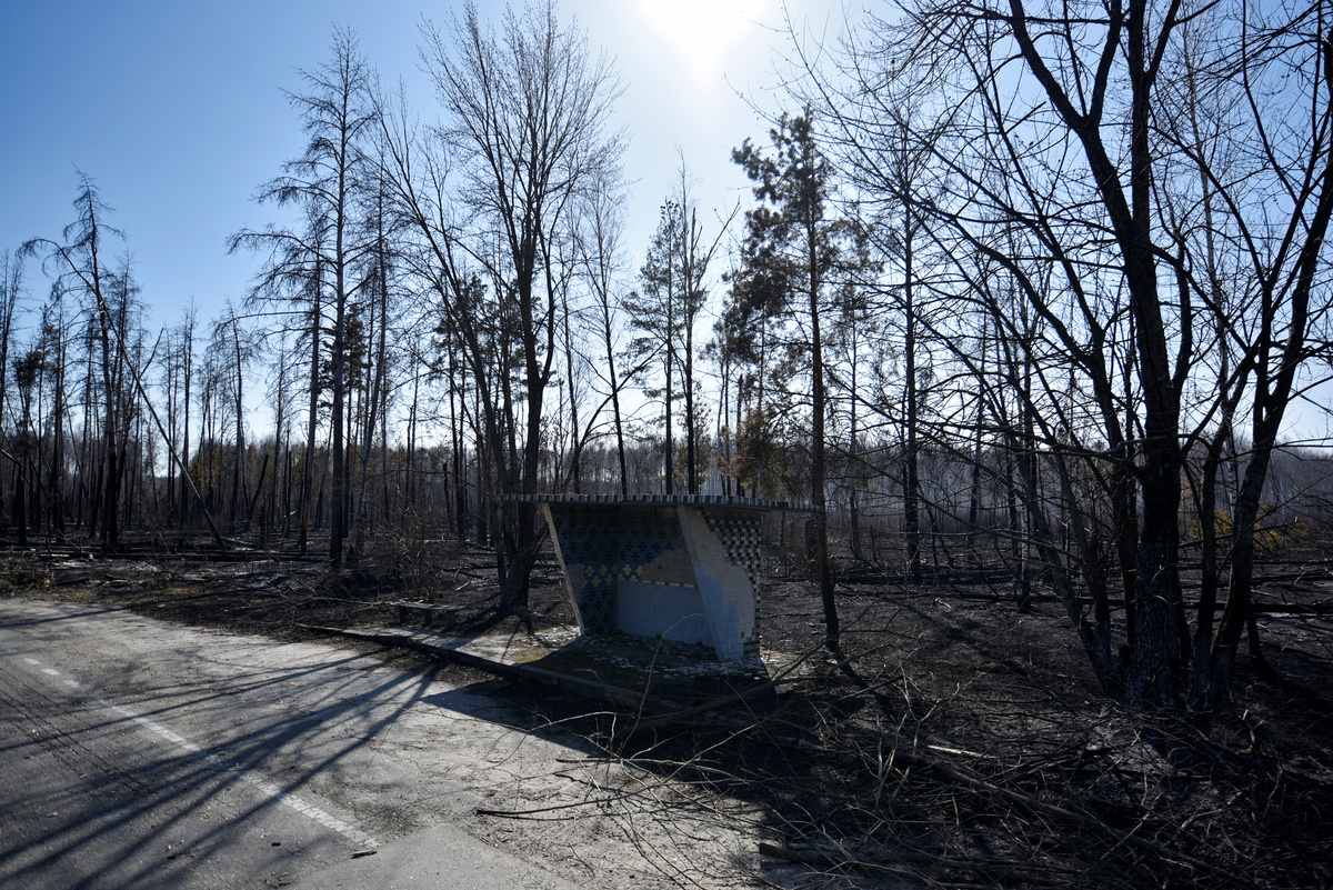 Aerial images of the 30 km (19 mile) exclusion zone around the plant, site of the world's worst nuclear accident in 1986, showed scorched, blackened earth and the charred stumps of still smouldering trees.