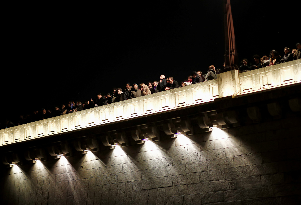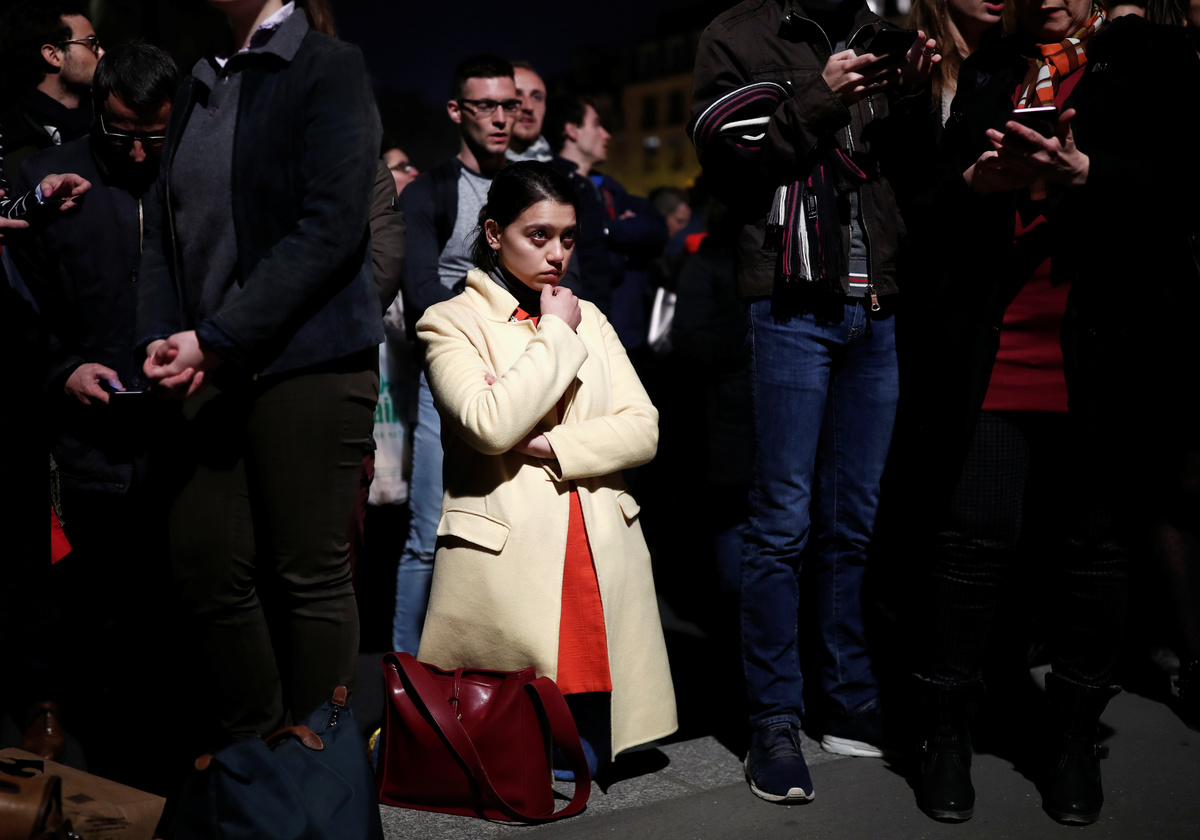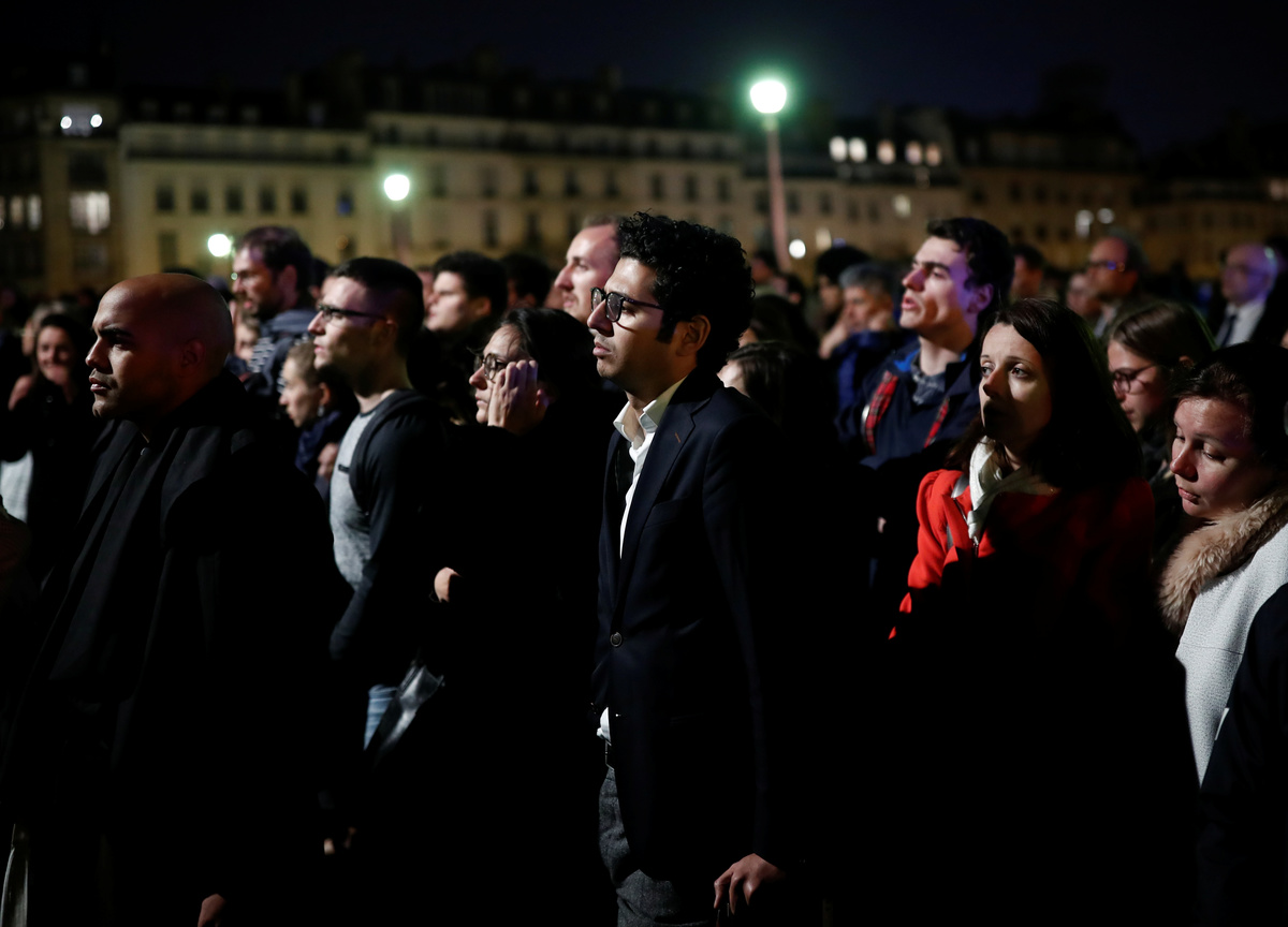 Thousands of onlookers lined bridges over the Seine and along its embankments, held at a distance by a police cordon. Some sang liturgical music in harmonies late into the night as they stood vigil, while others recited prayers.