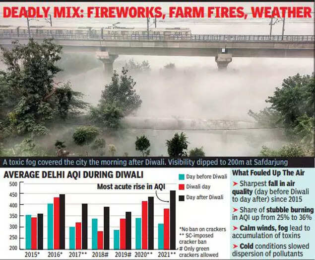 The widespread flouting of the Supreme Court order banning firecrackers added to other factors, creating a "perfect storm" of dirty air over the region. The wind direction and low wind speeds facilitated the transport of farm fire pollutants from neighbouring states. The share of pollution from stubble-burning in Delhi's AQI rose from 25% on Thursday to 36% on Friday, the highest so far this season.