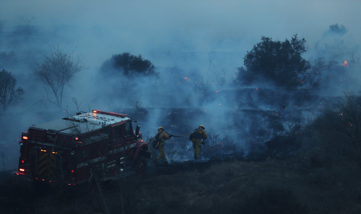 The Santa Ana winds, which blow hot and dry across Southern California to the Pacific, eased up on Friday, ranging from 5 miles per hour (8 km per hour) to 35 mph (56 kph). That turned out to be a mixed blessing for firefighters because the lingering smoke limited the use of water-dropping aircraft.