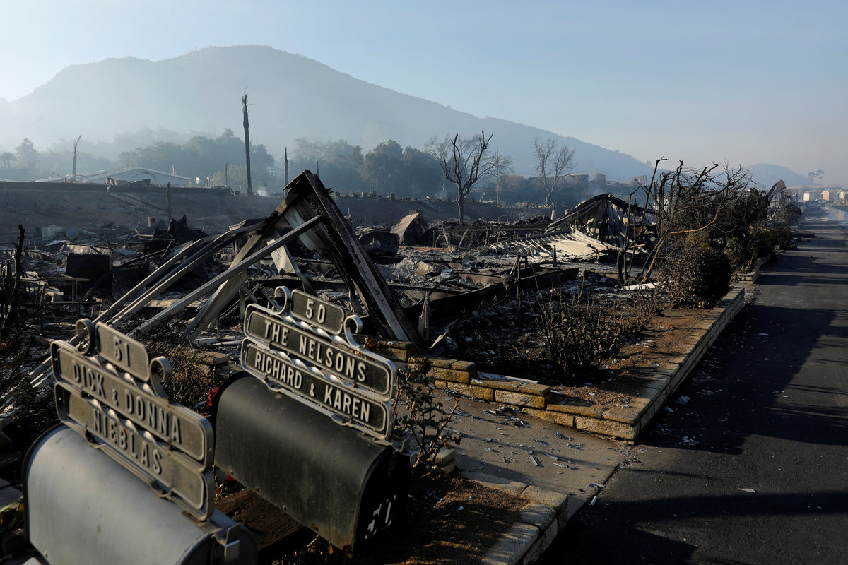 VENTURA, Calif. (Reuters) - Growing wildfires chewing through parts of Southern California on Friday ravaged avocado farms, racehorse stables and a retirement community, even as milder weather aided firefighters in their efforts to slow the progress of six major blazes.