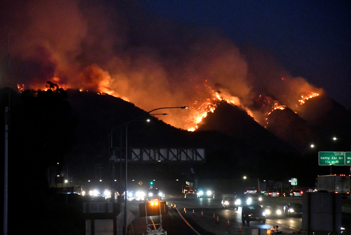 LOS ANGELES (Reuters) - Wind-whipped flames chased thousands of residents from wealthy Los Angeles neighborhoods and threatened the city's famed Getty Center museum on Monday, the latest outbreak in a wildfire season that has triggered mass evacuations and power outages across California.