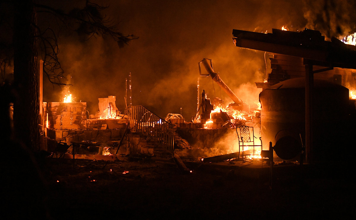 The fire in steep and rugged terrain has destroyed 10 homes and 20 outbuildings, the California Department of Forestry and Fire Protection has said.
