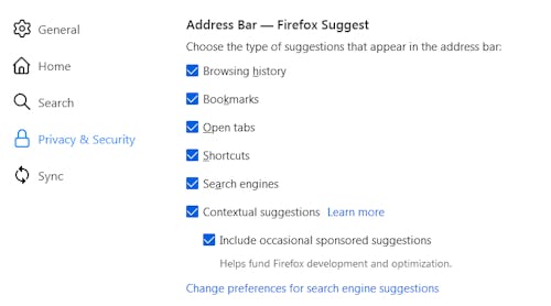 - Select Privacy & Security on the left and go down to the Address Bar — Firefox Suggest section