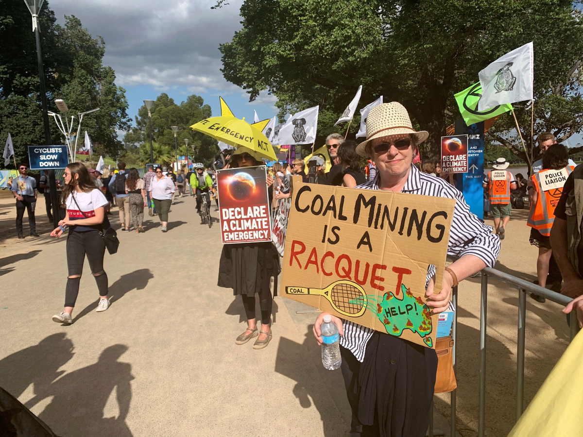 At a rally outside the Australian Open tennis tournament in Melbourne last month, protesters waved flags and stuck black tape over their mouths to show their anger at perceived climate inaction by Morrison's government. "We know that burning fossil fuels is the major problem for our greenhouse emissions and our country seems to be doing very little to change their ways," said retired teacher Libby Dougas, who was holding up a placard that read "Coal mining is a racquet".