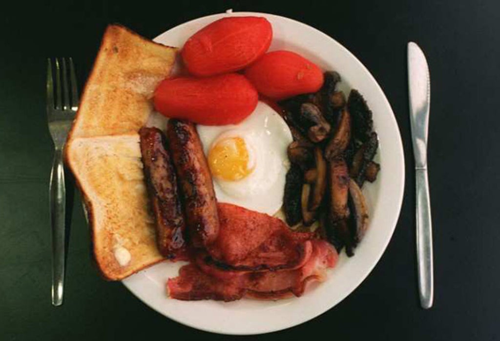 In England, a traditional cooked breakfast consists of sausages, grilled tomato, mushrooms, bacon, beans, fried egg, fried bread, black pudding, toast, tea, hash browns and brown sauce.