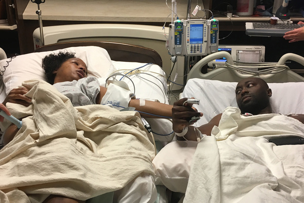 It shows Julie and Jevon lying side by side on separate hospital beds just before they go off to surgery _ him for his leg, her for the C-section. In the moment, they are holding hands, praying for their baby's life and health, and deciding on her name.
