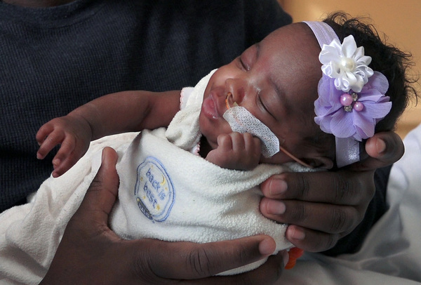 Last week, the couple held Juliana, now weighing more than 5 pounds, at the neonatal intensive care unit at Children's Mercy Hospital. Born at 1 pound, 11 ounces, tiny enough for Jevon to cup her entire body in his hands, she is thriving and should go home as early as next week or not long thereafter.