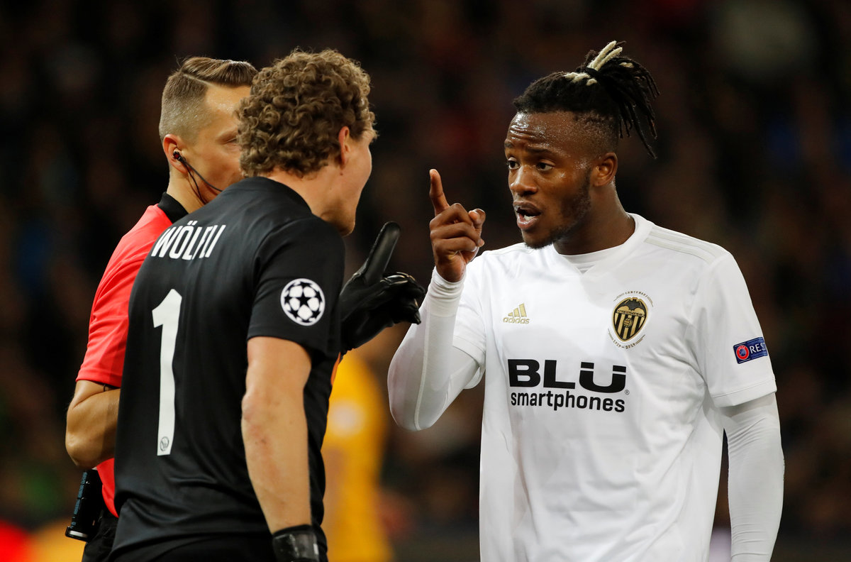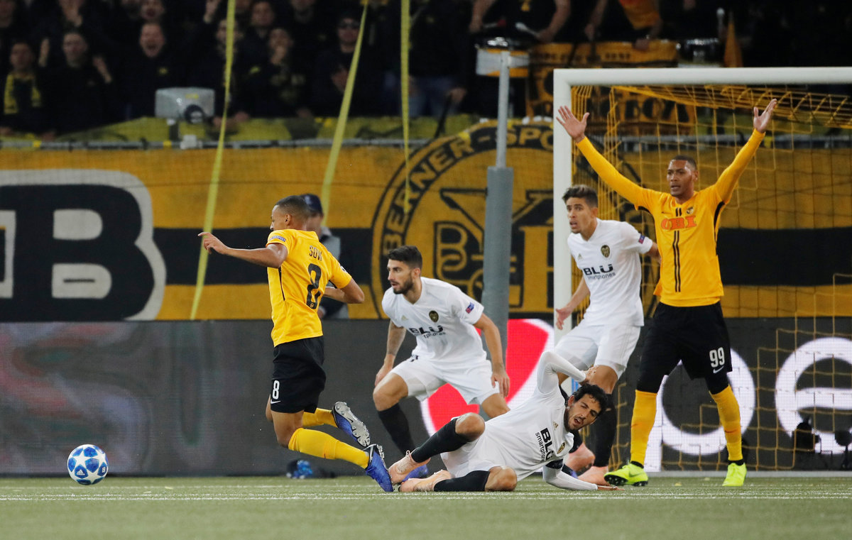 Soccer Football - Champions League - Group Stage - Group H - BSC Young Boys v Valencia - Stade de Suisse, Bern, Switzerland - October 23, 2018 Valencia's Rodrigo in action with Young Boys' Sandro Lauper REUTERS/Stefan WermuthSoccer Football - Champions League - Group Stage - Group H - BSC Young Boys v Valencia - Stade de Suisse, Bern, Switzerland - October 23, 2018 Young Boys' Guillaume Hoarau celebrates scoring their first goal with teammates REUTERS/Stefan WermuthSoccer Football - Champions League - Group Stage - Group H - BSC Young Boys v Valencia - Stade de Suisse, Bern, Switzerland - October 23, 2018 Young Boys are awarded a penalty by referee Andris Treimanis after Young Boys' Djibril Sow is fouled by Valencia's Dani Parejo REUTERS/Stefan WermuthSoccer Football - Champions League - Group Stage - Group H - BSC Young Boys v Valencia - Stade de Suisse, Bern, Switzerland - October 23, 2018 Valencia's Michy Batshuayi scores their first goal REUTERS/Stefan WermuthSoccer Football - Champions League - Group Stage - Group H - BSC Young Boys v Valencia - Stade de Suisse, Bern, Switzerland - October 23, 2018 Valencia's Michy Batshuayi scores their first goal REUTERS/Stefan WermuthSoccer Football - Champions League - Group Stage - Group H - BSC Young Boys v Valencia - Stade de Suisse, Bern, Switzerland - October 23, 2018 Valencia coach Marcelino Garcia during the match REUTERS/Stefan Wermuth