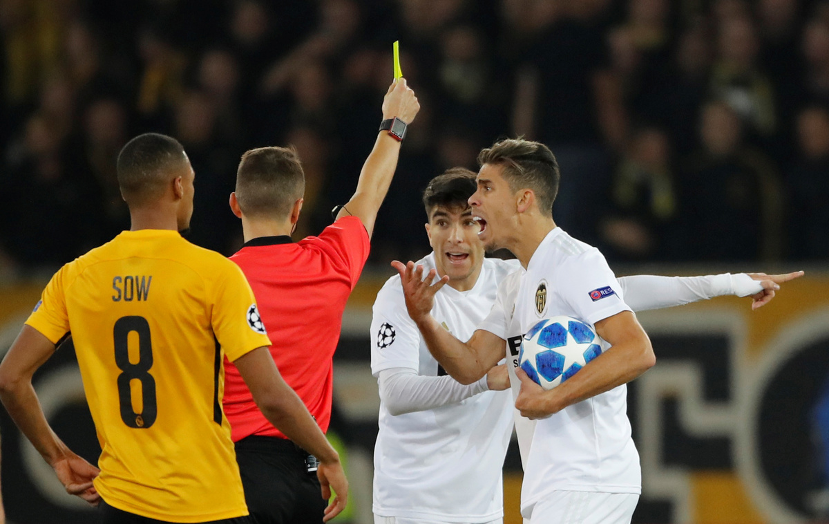 Soccer Football - Champions League - Group Stage - Group H - BSC Young Boys v Valencia - Stade de Suisse, Bern, Switzerland - October 23, 2018 Valencia's Carlos Soler is shown a yellow card by referee Andris Treimanis REUTERS/Stefan Wermuth