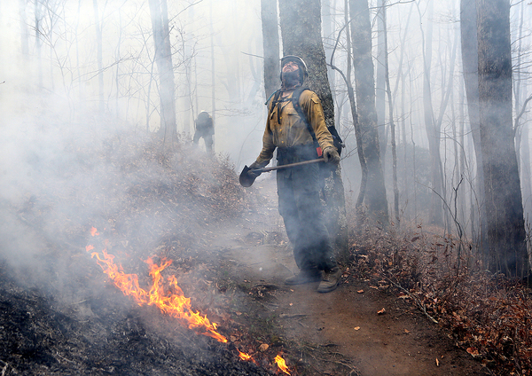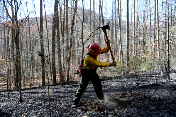 As winds pushed the fire back toward itself on the north, crews swept leaves and worked to decrease the intensity of the fire by lighting their own smaller blazes Tuesday near Bettys Creek Road.