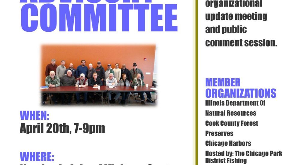 - The Chicago Fishing Advisory Committee holds its first evening meeting Thursday, April 20, at the Northerly Island Visitor Center, 1521 S. Linn White Drive. The meeting begins at 7 p.m.