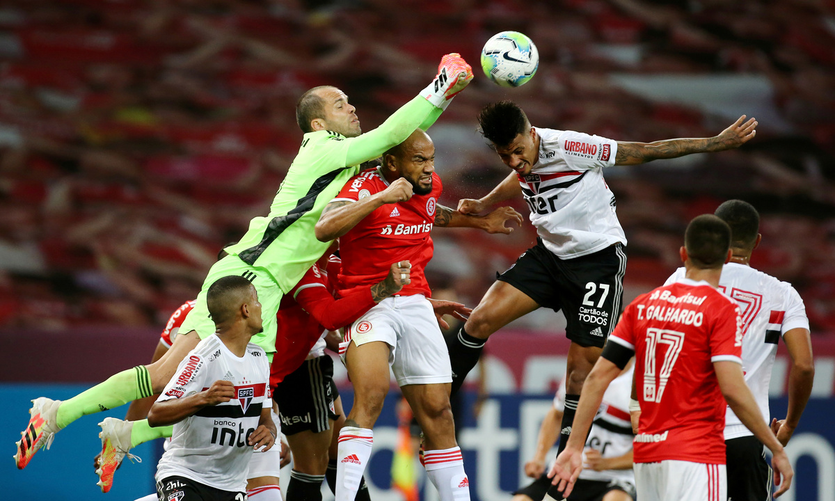 Soccer Football - Brasileiro Championship - Internacional v Sao Paulo - Beira Rio stadium, Porto Alegre, Brazil - September 26, 2020 Internacional's Marcelo Lomba in action with Sao Paulo's Diego Costa REUTERS/Diego Vara