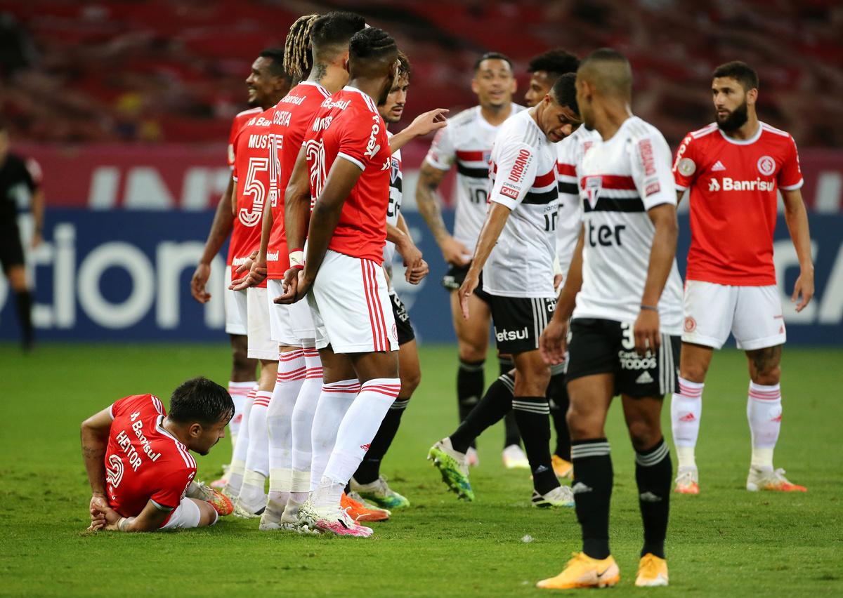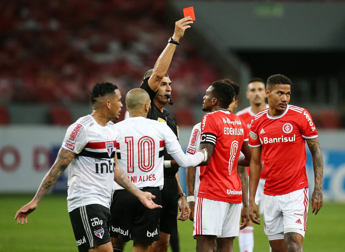 Soccer Football - Brasileiro Championship - Internacional v Sao Paulo - Beira Rio stadium, Porto Alegre, Brazil - September 26, 2020 Internacional's Heitor forms a defensive wall with teammates REUTERS/Diego VaraSoccer Football - Brasileiro Championship - Internacional v Sao Paulo - Beira Rio stadium, Porto Alegre, Brazil - September 26, 2020 Internacional's Jose Gabriel is shown a red card by referee Marcelo de Lima REUTERS/Diego Vara
