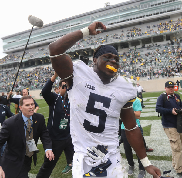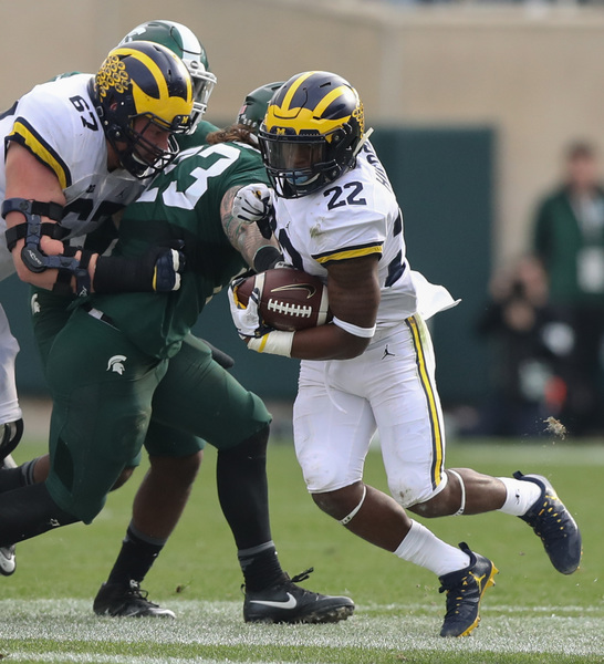 Yet Michigan found its own ground game, as usual spread between a gaggle of players (nine, including quarterback Wilton Speight) and actually outrushed the Spartans by halftime.