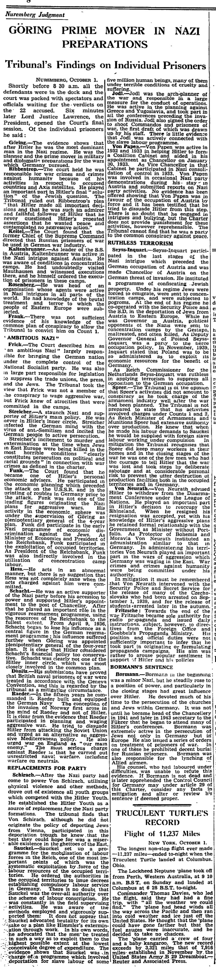 Twenty-one Nazi leaders in the Nuremberg courtroom yesterday heard the first judgments of the International War Crimes Tribunal. To-day they will reappear separately in the dock and hear the findings against themselves individually, the sentences being expected this afternoon. The main points in yesterday’s judgment were –