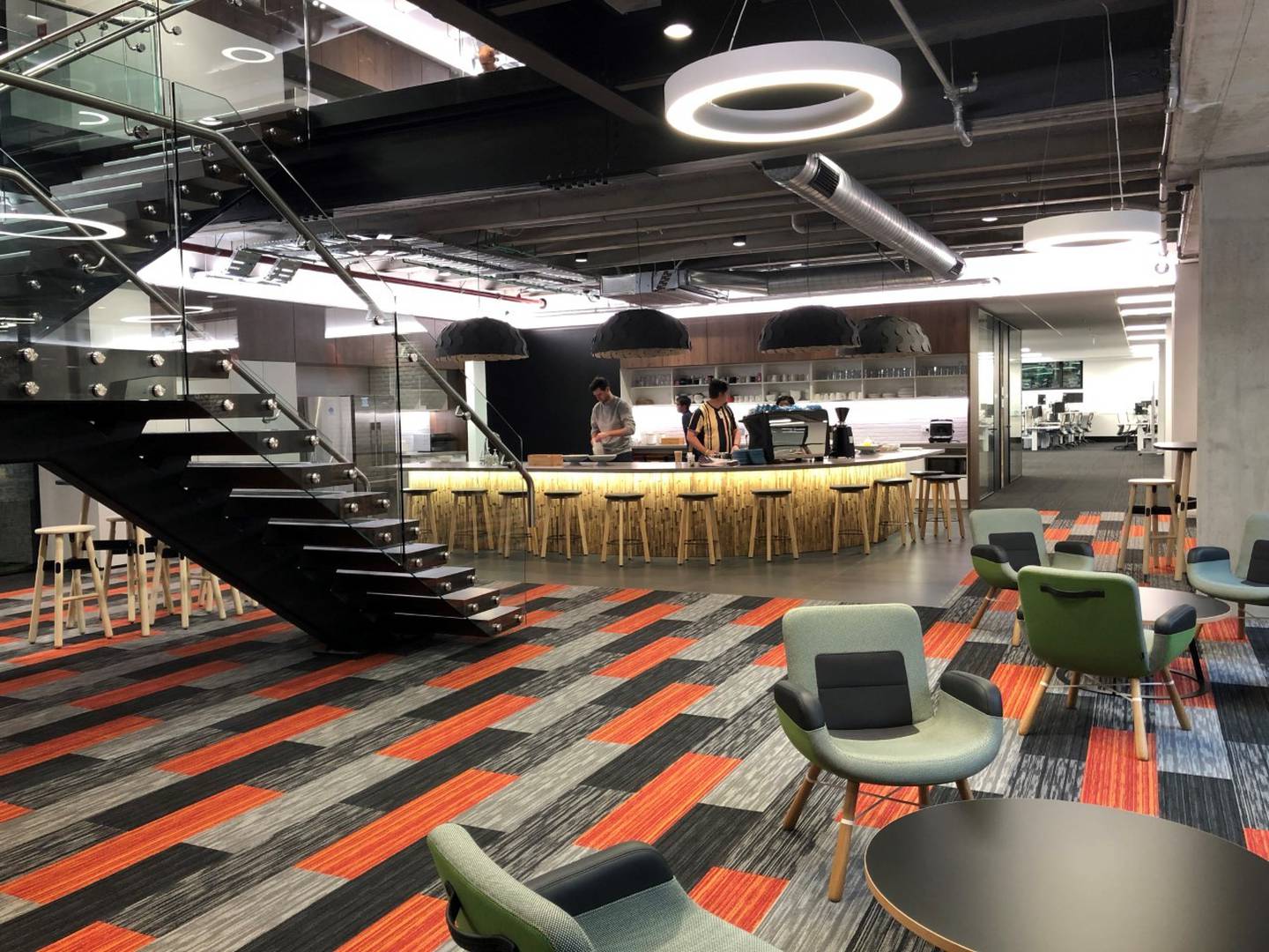 A wellness room, small gym with meditation/relaxation/massage area, X-Box and Playstation, table tennis, pool table and foosball are provided for staff who move around via activity-based work and have wrist-bands with chips allowing entry to lockers and onto their two floors.