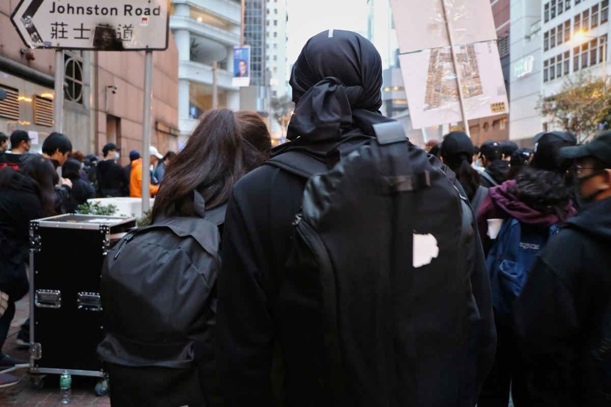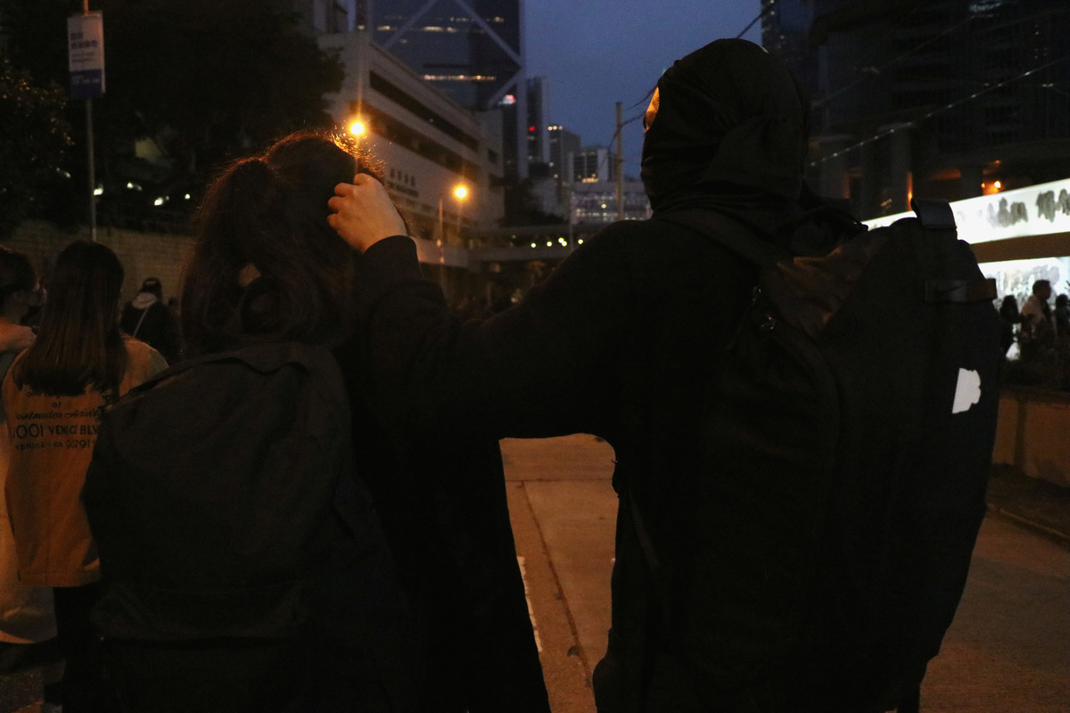 After that day, the two began attending more rallies and protests together. They formed a new daily routine: Tony would pick Wing up from school or her part-time job as a barista, then they would find a quiet alley away from the CCTV cameras to change into their "black bloc" clothes, a front-line uniform of black clothes and masks to blend into the crowd.
