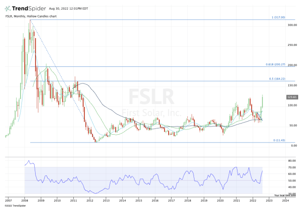 As for the upside, let’s turn to the monthly chart to get a better idea of where First Solar stock has been and where it can go from here.