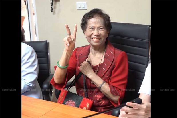 Jaimuay Sae Ung, of Nakhon Pathom, having recovered from the novel coronavirus, spoke at a media conference at Nakhon Pathom Hospital on Tuesday.