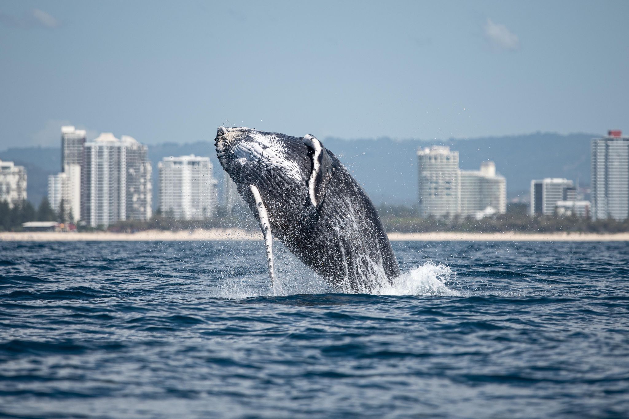 The whale -- which is off Surfers Paradise Beach -- is the first confirmed whale entangled in shark nets on the Gold Coast this season.