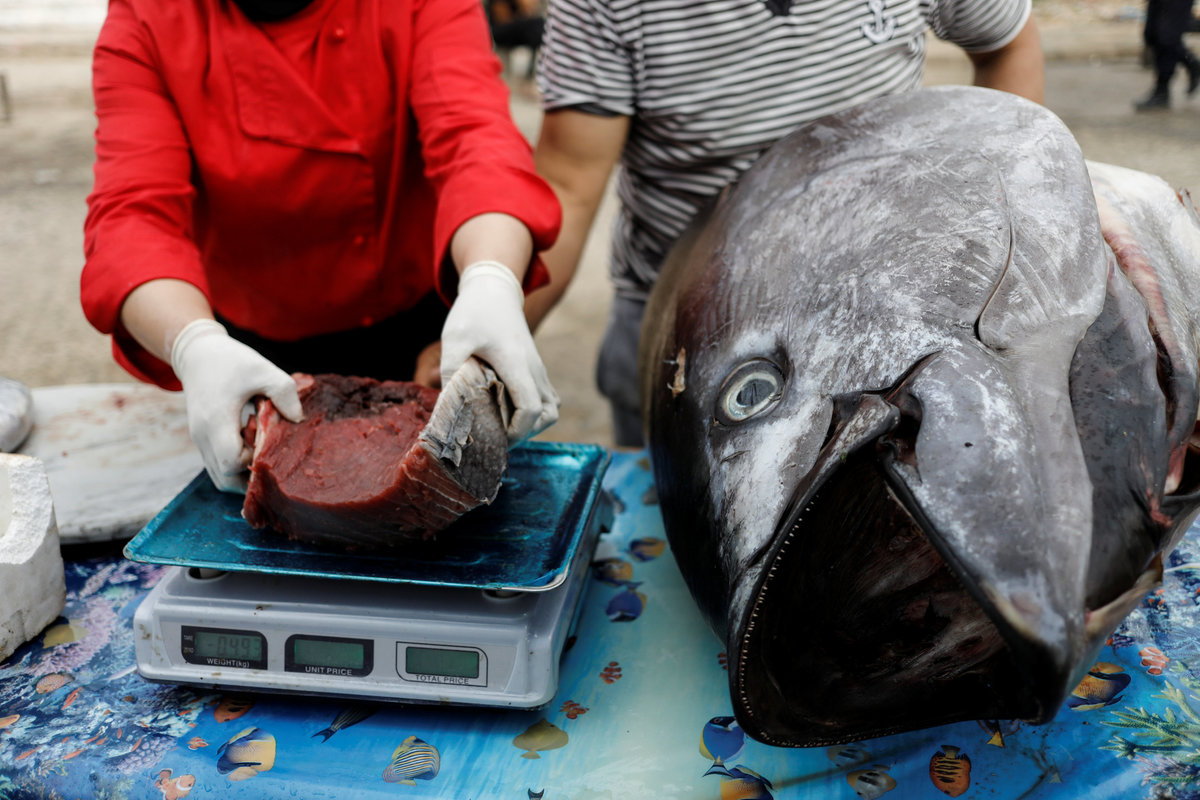 Karima Daikhi, 52, weighs a piece of tuna as she shops for Iftar (breaking fast) meals that she will sell during the holy fasting month of Ramadan, at Bouharoun's fishermen's port in the commune of Tipaza Province, Algeria May 27, 2018. Picture Taken May 27, 2018. REUTERS/Zohra Bensemra