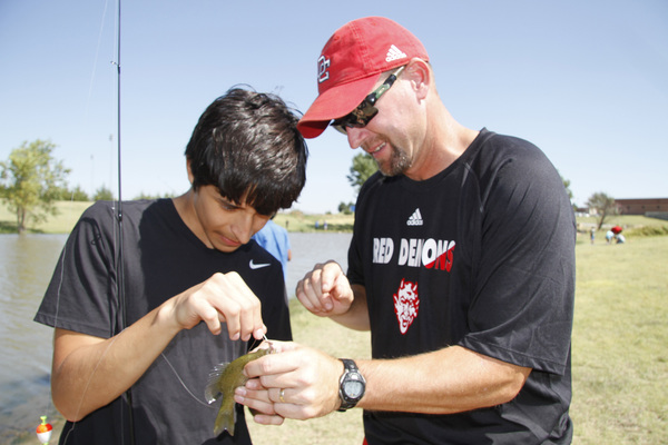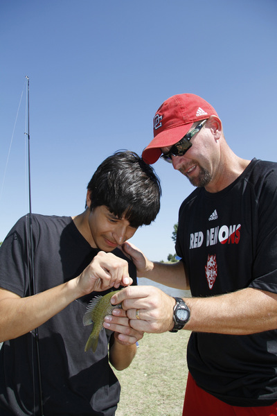 Fifteen minutes, and three more bluegill later, it wasn't just the fish that were hooked. Coca was baiting his hook and unhooking fish with ease, and said he would go fishing again. Most of the dozen classmates who shared his side of a two-acre pond said the same.
