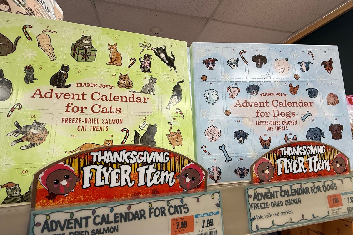 A cat calendar at Trader Joe’s has freeze-dried sweet potato and salmon treats, while their dog version is all about the chicken — also freeze-dried. $7.99.