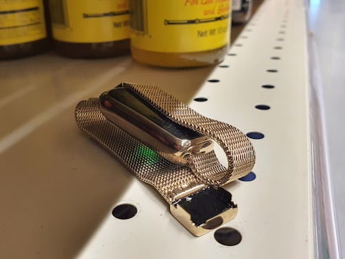 There’s also the issue of the mesh bracelet’s magnet placement. Because it doesn’t fold back on itself as most third-party offerings do and the magnet is in the outer clasp, it’s liable to come undone and stick to all sorts of things. In my case, that’s included cast iron pots and pans, the legs of my desk, and — in one instance — a shelf of duck sauce in a Wegman’s grocery store.