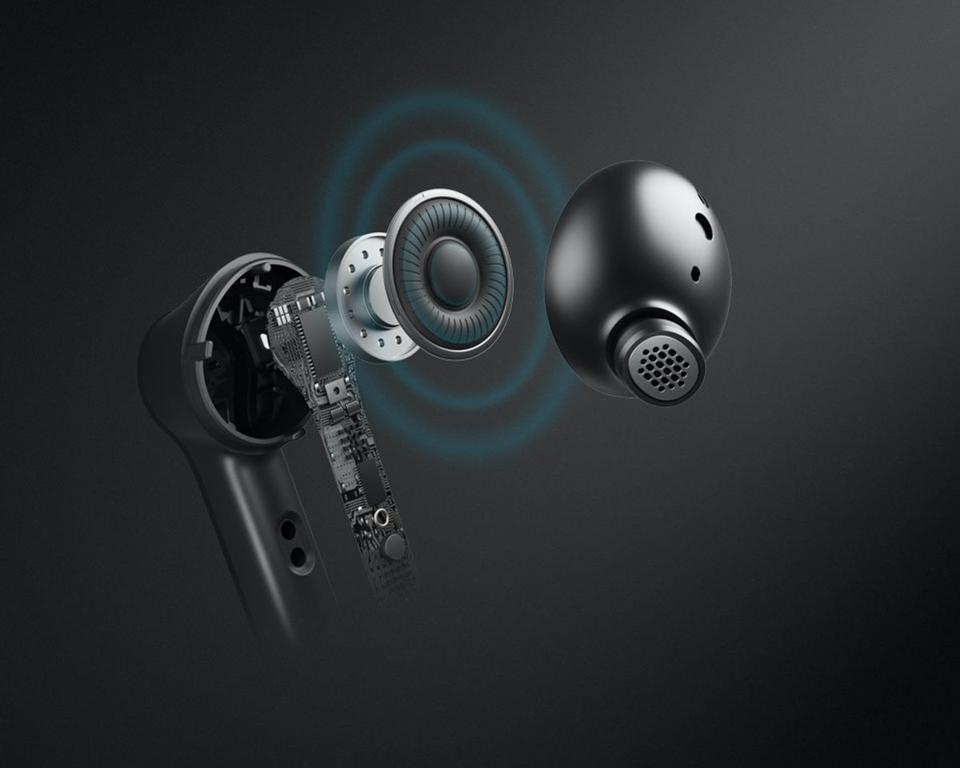 These earbuds include six microphones which are used for both sampling sound to be cancelled by the hybrid ANC circuitry and for picking up the user’s voice when making phone calls and video chats.