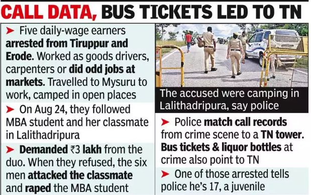 Mysuru: The special investigating team on Saturday arrested five of the six men who allegedly raped an MBA student from Mumbai after assaulting her friend at the Chamundi foothills on the night of August 24. A manhunt is on for the remaining accused; one of those arrested is believed to be a juvenile.