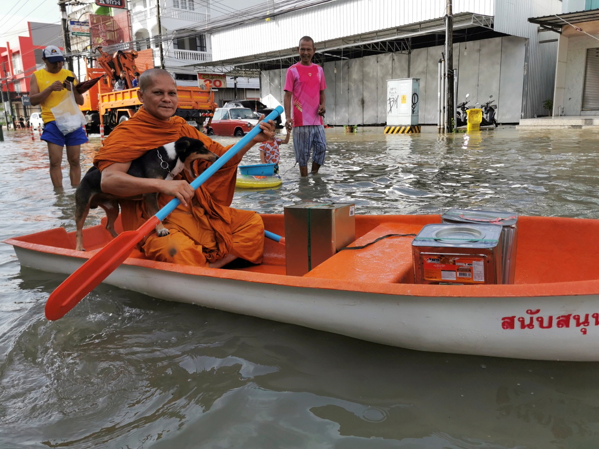 Other images showed people wading or pushing motorcycles through thigh-deep water while some residents, including a Buddhist monk, rowed boats through commercial areas where children played.