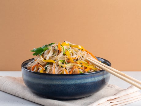 Japchae is a savoury Korean stir-fry with mixed vegetables, beef and sweet potato noodles. Also known as glass noodles, sweet potato noodles can be found in Asian markets; once cooked, the noodles turn translucent, light and chewy (they are also wheat-free, so they are a great option for those avoiding gluten). The noodles are cooked first, then sit in the sauce, absorbing all of the garlicky sesame and soy flavours like a sponge. This springtime japchae celebrates crisp asparagus and snap peas. Japchae can be made a few hours ahead and served at room temperature, making it the perfect dish for picnics.
