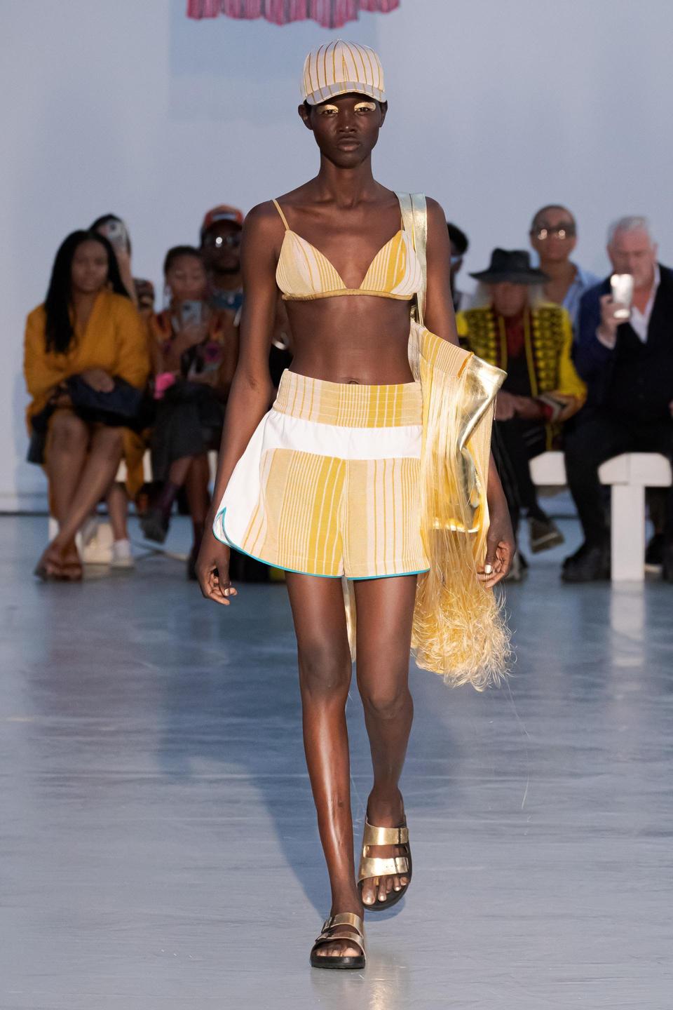 Since participating in the 2019 LVMH Prize as a finalist, Ize brand has gained steam each season. His Spring 2022 collection kicked off fashion week and furthered his collection with elevated textiles. The emotional designer said post-show that his inspiration came from ‘the new dawn of the new era we are living,’ which was expressed in a group of golden fringed pieces juxtaposed to the explosion of color through checked and striped fabrics. Born in Vienna to Nigerian parents, the designer highlights Yoruba craft skills with textiles woven in Nigeria, blending traditional African and Western influences with a non-gender-conforming style. Supermodel Naomi Campbell supporting his first show helped the designer get noticed by the industry. Recently he was tapped to design a capsule collection for the Karl Lagerfeld collection, the first since the founder’s death, under the direction of Carine Roitfeld. Currently, his clothes are sold at Matches Fashion and Farfetch. Retail prices range from approximately 350 to 1150 USD.