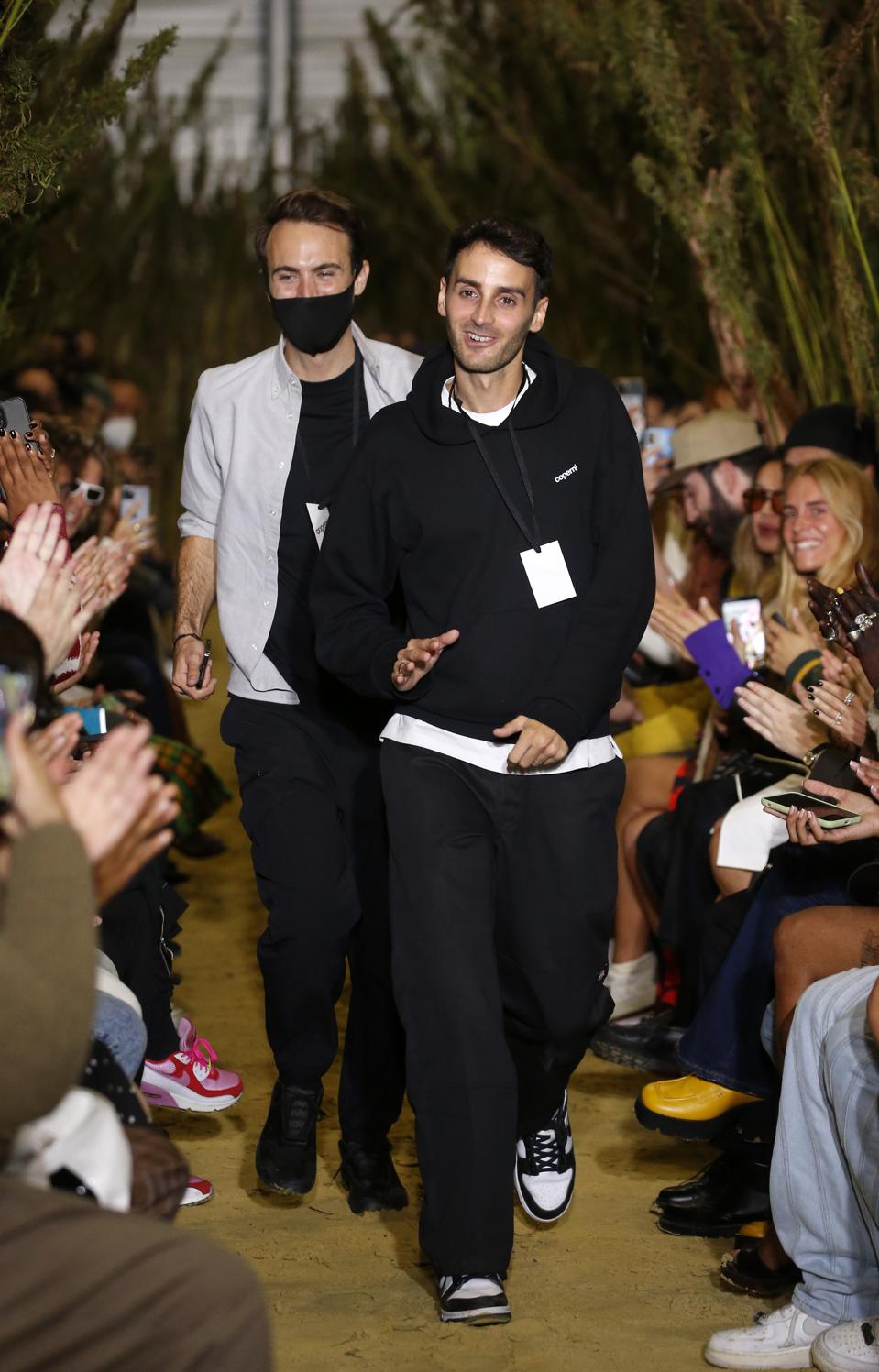 When Sébastien Meyer and Arnaud Vaillant were named co-creative directors of Courrèges in 2015, they recused themselves from the finalist status for the 2015 LVMH Prize. Previously they had won the ANDAM First Collection Prize in 2014 and put their label, Coperni, on hold. They relaunched the brand in 2019 upon exiting Courrèges and have been building brand awareness steadily through a signature oval-shaped handbag and their disruptive approach like staging a runway show during the pandemic where guests viewed from cars in groups of three and four. This season the duo chose a sandy runway flanked by chanvre or hemp plants for a collection that channeled the beach club scene of the 90s; think Ibiza or Miami Beach nightlife from the era. The fun party-ready collection included Pucci-esque prints on legging and go-go shorts, shell-laden miniskirts and halters, wet-suit liner tops, shrunken bombers, and a blotter acid print to wink at the dance all night lifestyle espoused in this world. Coperni is stocked at Bergdorf Goodmen, Nordstrom, Lane Crawford