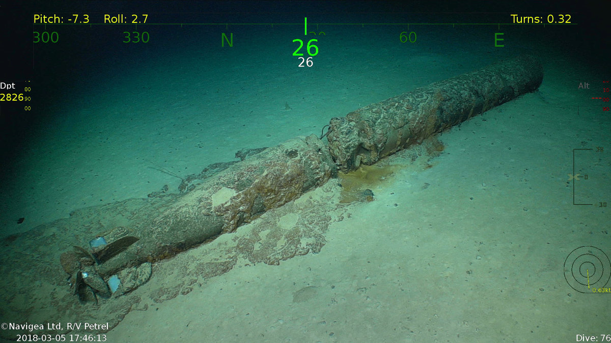 Allen's team posted close-up video of its anti-aircraft guns, the ship's name still visible on the hull, and a torpedo lying on the sea floor.