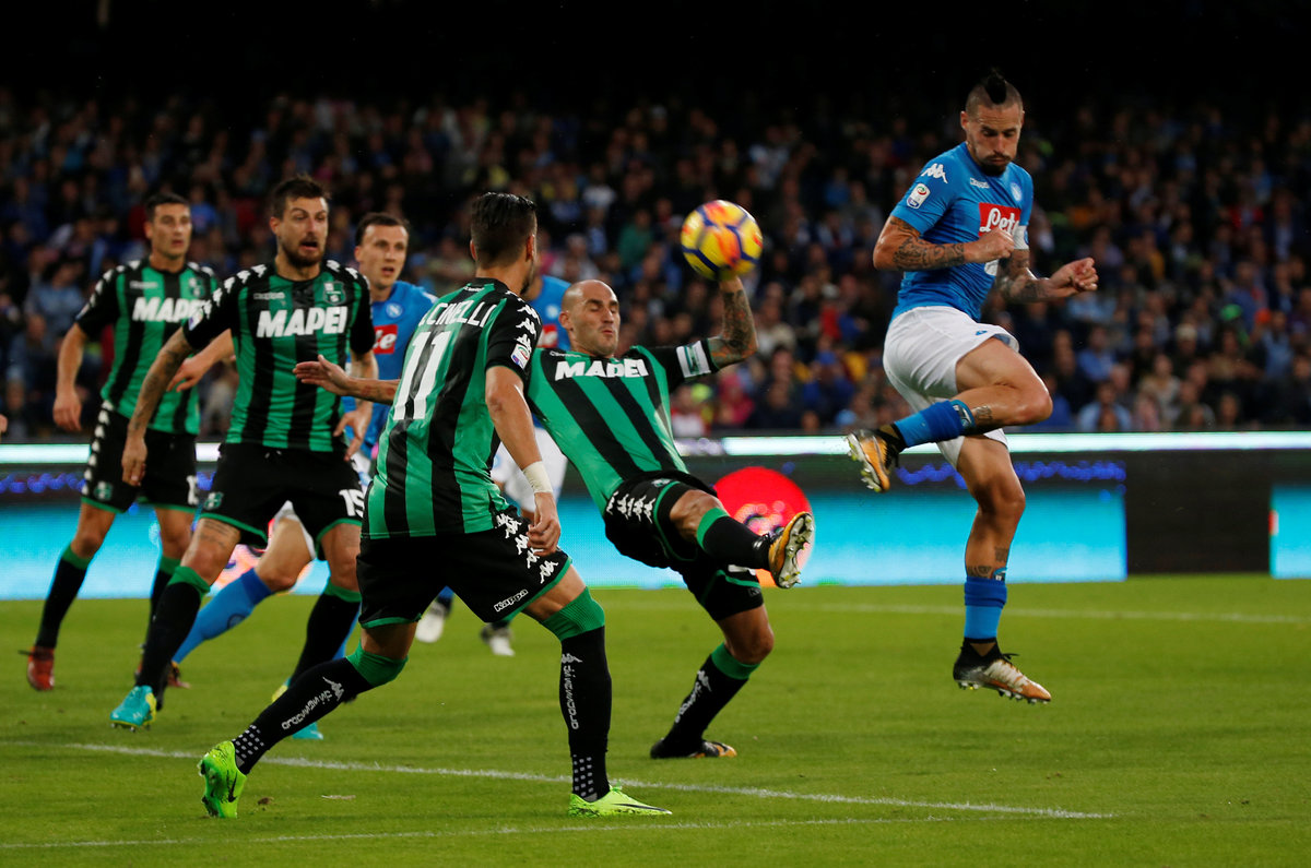 Faouzi Ghoulam volleyed against the post as Napoli dominated until Sassuolo levelled out of the blue in the 41st minute, Diego Falcinelli beating three defenders to the ball to meet Matteo Politano's cross with a towering header.