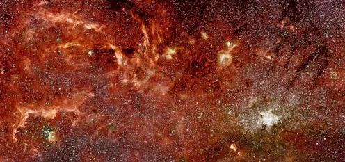 This image looks deeper into space to the centre of our Milky Way Galaxy. It also uses infrared light, this time combining data from two Nasa telescopes, Hubble and Spitzer.
