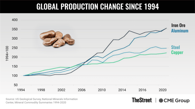 Over the past three decades, mining output for copper grew far more slowly than for most other metals, rising just 123%. Over the same period, aluminum production grew by 256% and iron ore production rose by 257%. Since 2013 copper mining output has grown slowly, at just 1.7% per year, less than half aluminum’s 4.6% annual pace of supply growth.