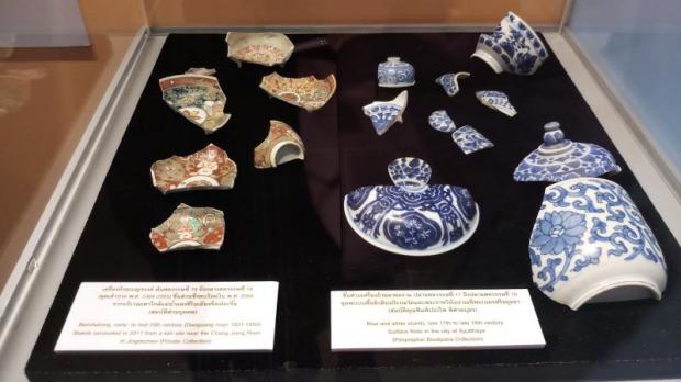 Also at the exhibition, two groups of archaeological shards are exhibited for the first time. These blue and white porcelain shards with Siamese designs of the 17th century were found on the grounds of the palace at the old capital of Ayutthaya. They confirm that blue and white porcelain was a predecessor to Bencharong. Meanwhile, mid-19th century Bencharong shards from a recent excavation near Jingdezhen provide the only evidence that some of the enamelling was done there.