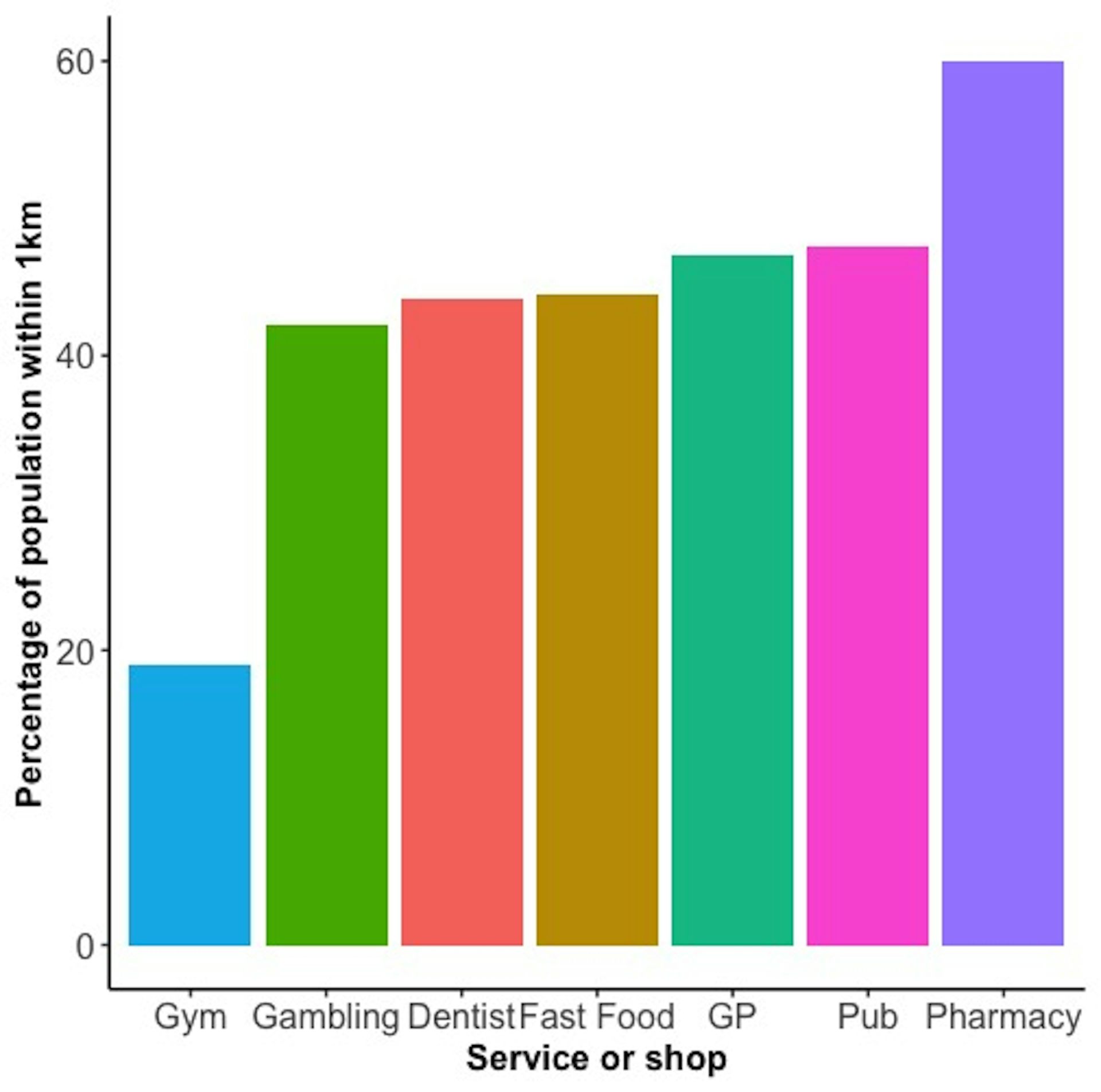 Our data (derived from retail statistics, NHS, Ordnance Survey and DEFRA) reveals insights about the concentration of certain amenities that may damage or promote health. For example, on average, people in Britain are located as close to a pub or bar as they are to their nearest GP (1.1km) and 42% of people are within a kilometre of a gambling outlet.