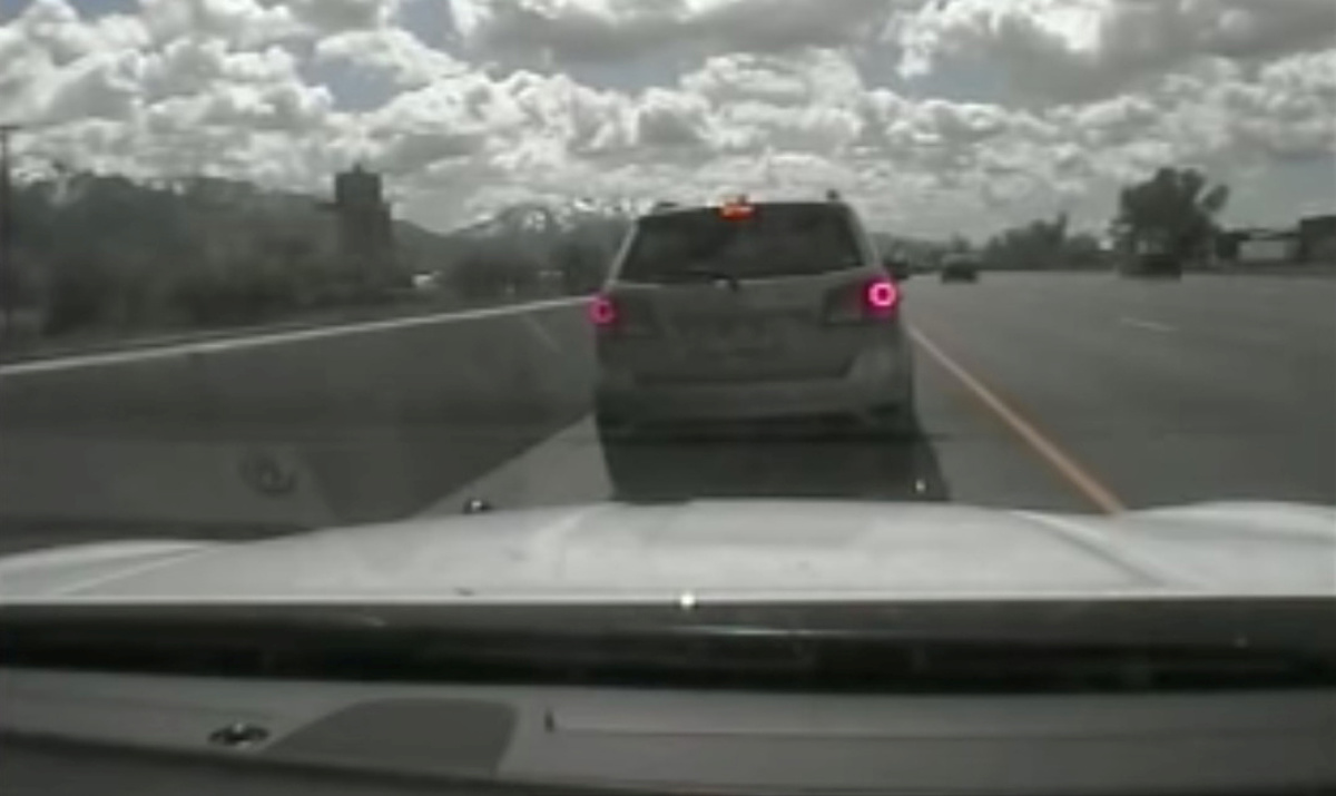After seeing a vehicle driving slowly and weaving in the left lane of the Interstate 15 freeway, the trooper turned on his siren, and the driver neatly pulled over to the side of the road.