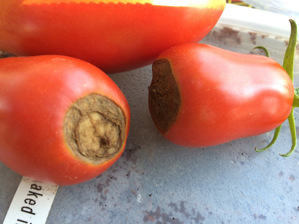 Tomatoes and squash often develop this condition that causes the bottom end of the fruit to turn brown and mushy. It's caused by widely fluctuating soil moisture that prevents the plant from taking in calcium.