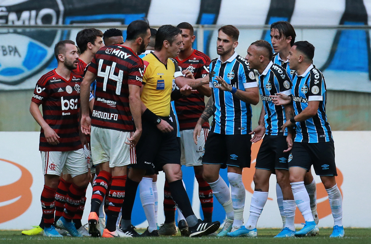 Soccer Football - Brasileiro Championship - Gremio v Flamengo - Arena do Gremio, Porto Alegre, Brazil - November 17, 2019 Gremio's Everton argues with referee Rapahel Claus REUTERS/Diego Vara