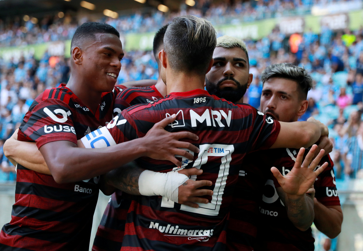 Soccer Football - Brasileiro Championship - Gremio v Flamengo - Arena do Gremio, Porto Alegre, Brazil - November 17, 2019 Flamengo's Gabriel celebrates scoring their first goal with team mates REUTERS/Diego Vara