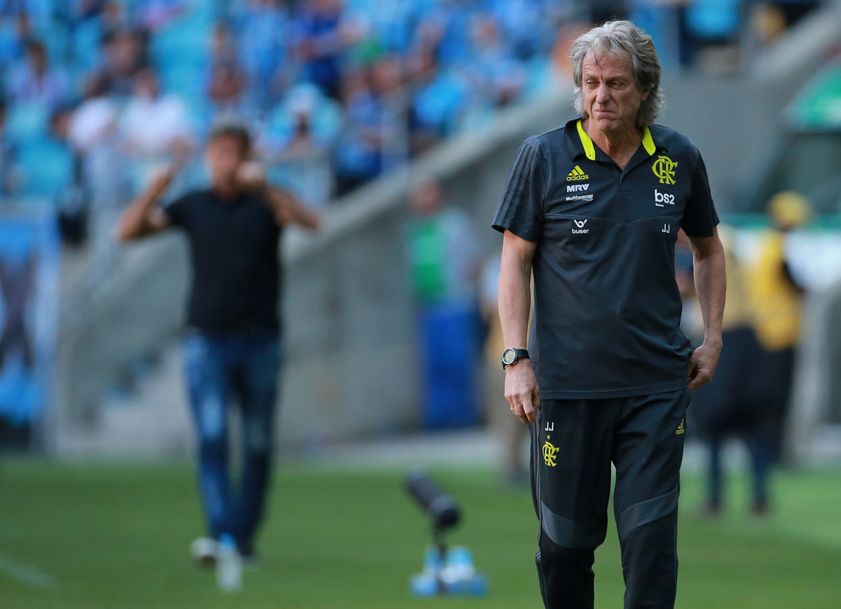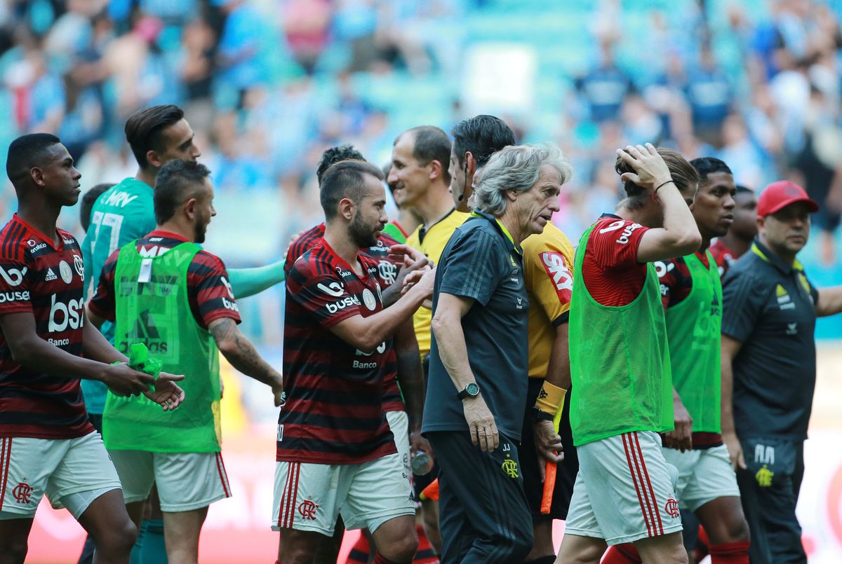 Soccer Football - Brasileiro Championship - Gremio v Flamengo - Arena do Gremio, Porto Alegre, Brazil - November 17, 2019 Flamengo coach Jorge Jesus REUTERS/Diego VaraSoccer Football - Brasileiro Championship - Gremio v Flamengo - Arena do Gremio, Porto Alegre, Brazil - November 17, 2019 Gremio's Everton in action with Flamengo's Rodinei REUTERS/Diego VaraSoccer Football - Brasileiro Championship - Gremio v Flamengo - Arena do Gremio, Porto Alegre, Brazil - November 17, 2019 Flamengo coach Jorge Jesus and players celebrate after the match REUTERS/Diego Vara