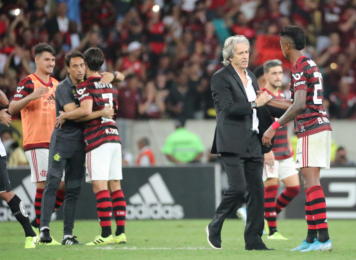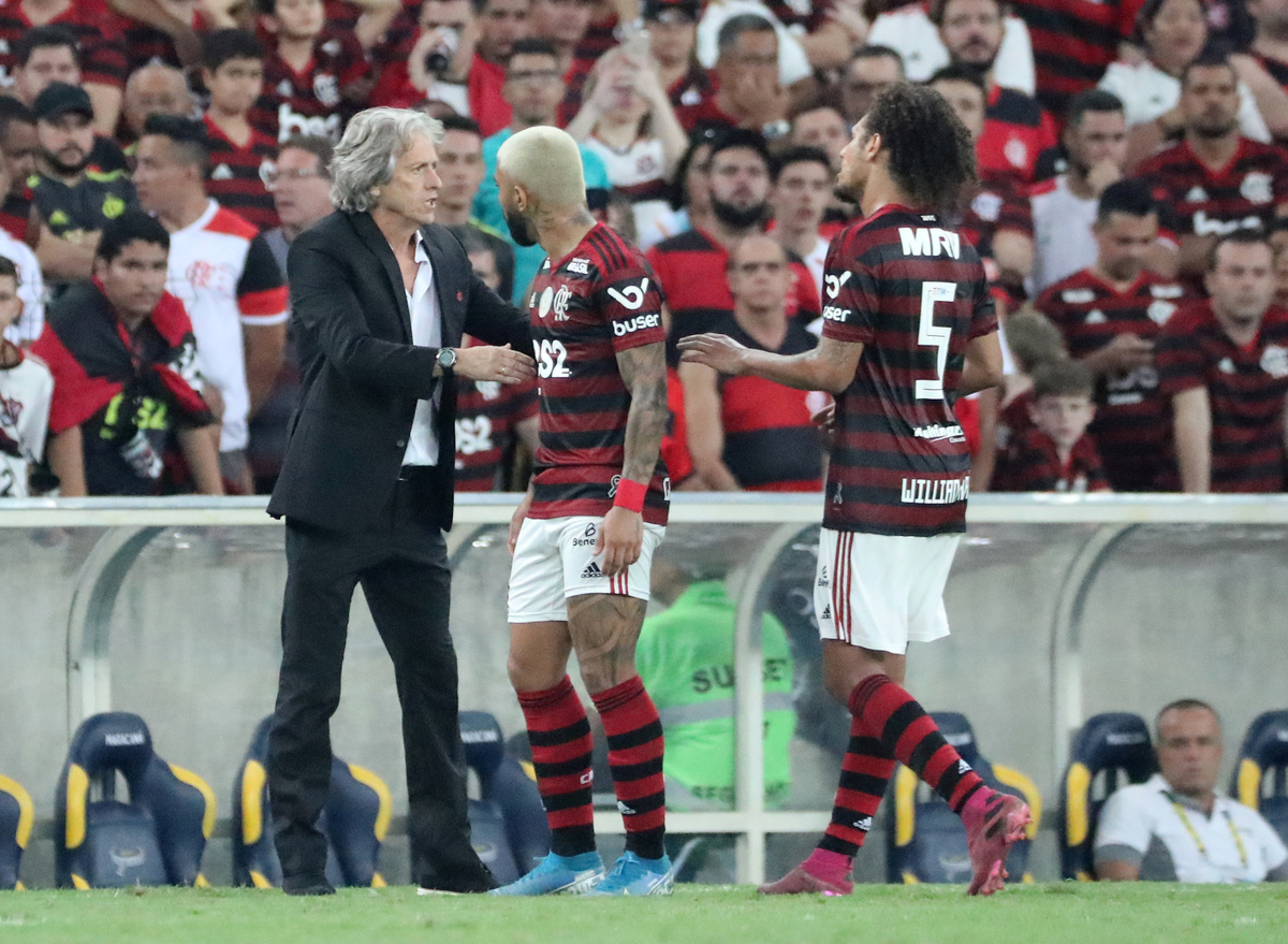 Soccer Football - Brasileiro Championship - Flamengo v Santos - Maracana Stadium, Rio de Janeiro, Brazil - September 14, 2019 Flamengo coach Jorge Jesus, Willian Arao and Gabriel during the match REUTERS/Sergio Moraes